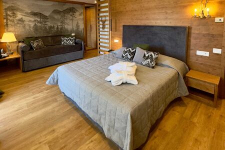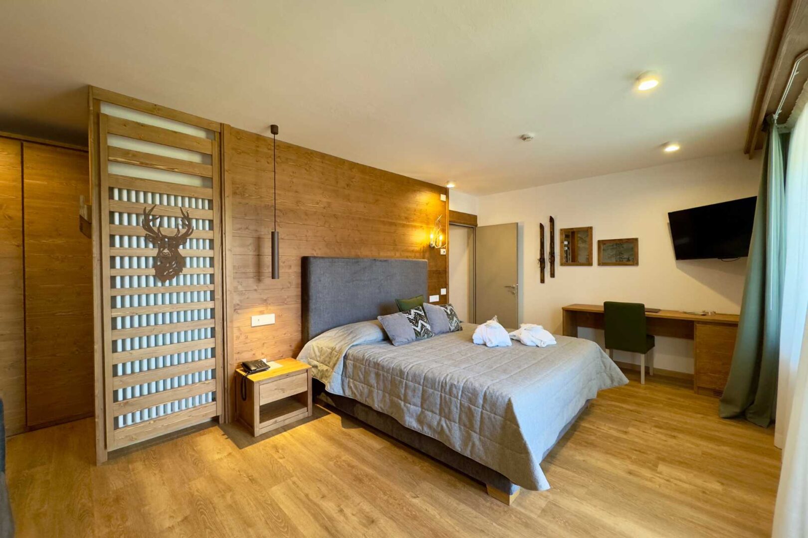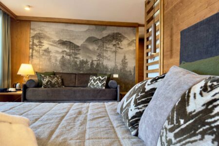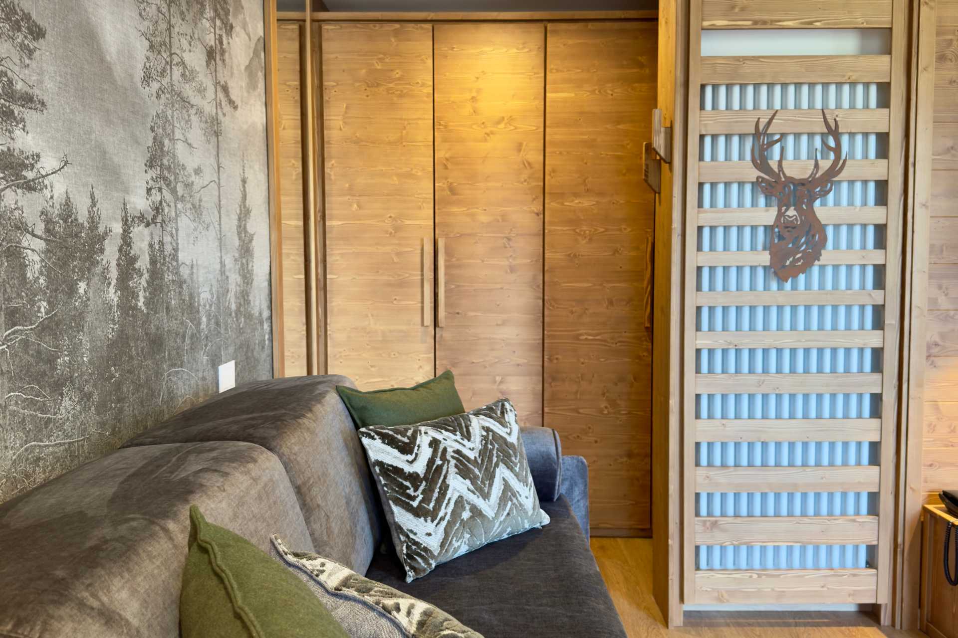 Gli ambienti, dal design lineare e pulito, fondono il calore dell’arredo di montagna con un’eleganza raffinata e accogliente, creando un’atmosfera intima e rilassante, ideale per soggiorni in famiglia o in coppia.